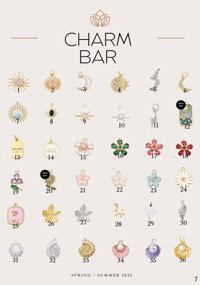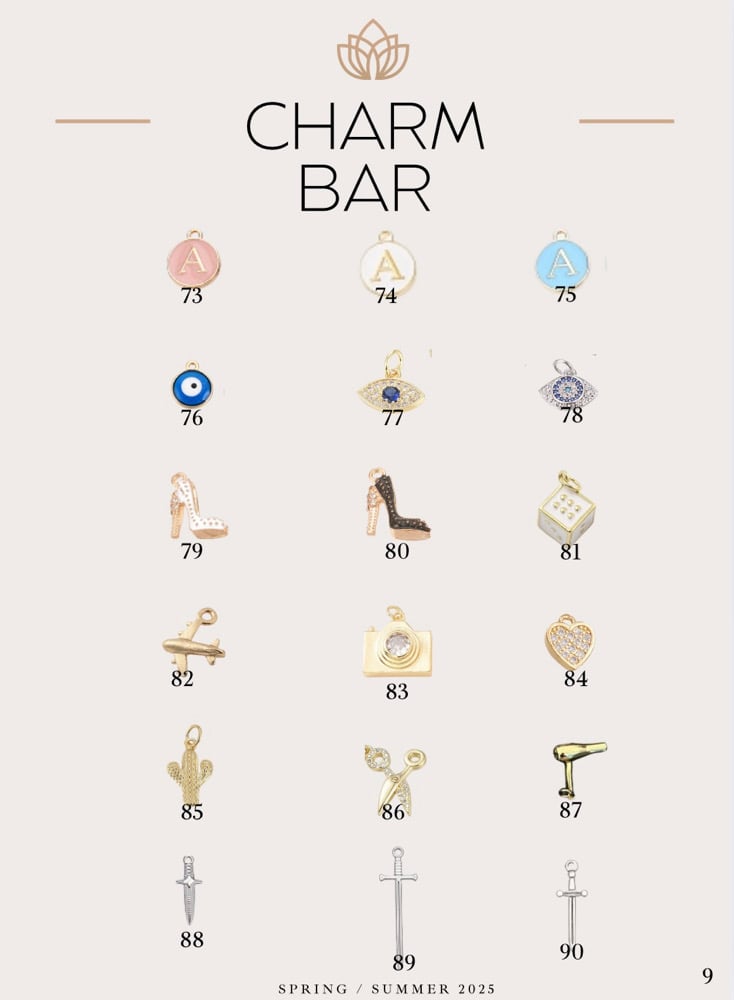 ¡Crea tu pulsera de charms! En el área de checkout, en order summary, encontrarás una frase que dice “need to leave a note or instructions?” una vez te salga la caja escríbenos el número de los charms dependiendo de la cantidad que escogió y luego déjanos saber el orden en el que desea los charms en su cadena.